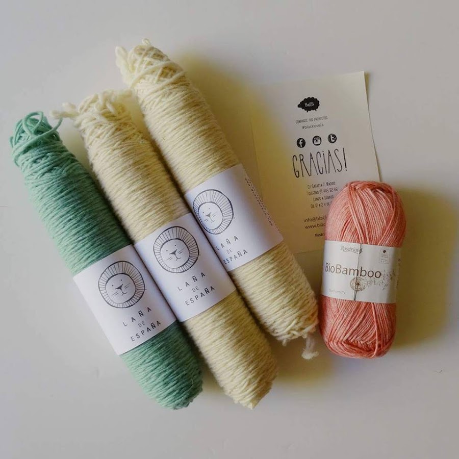 La compré en Black Oveja, una tienda por la que tengo que pasar si o si cuando vaya a Madrid, y cogí 2 "ovillos" en blanco roto y uno en color agua. También cogí un ovillo de 100g de 100% bambú, que es muy muy muy suave! (y con el que he hecho mis primeros calcetines por cierto)