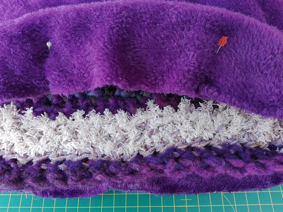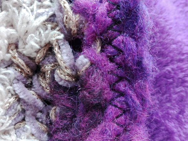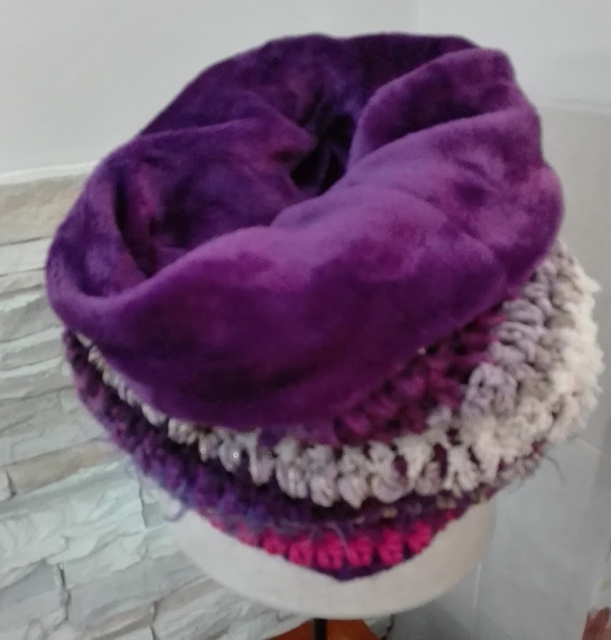 Materiales del cuello: restos de lana gruesa en varias texturas, lana fina (trabajada en grupo para que los puntos tengan más o menos el mismo grueso), ganchillo adecuado, tijeras y para el forro, tela polar en tono violeta oscuro.