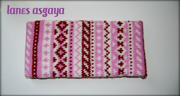 Usé "Merino Extra" de Valeria di Roma, en color lila (el color preferido de mi sorprendida), crudo y granate. Y lo tejí con agujas de 3.75 mm. Tiene una circunferencia de 26 cm, así que nos queda un cuello de 13 cm de ancho.