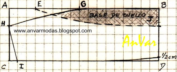 Hacer un rectángulo con la mitad de escote en el que va a ir cosido el cuello por 8 cms. de ancho, ptos. ABCD.