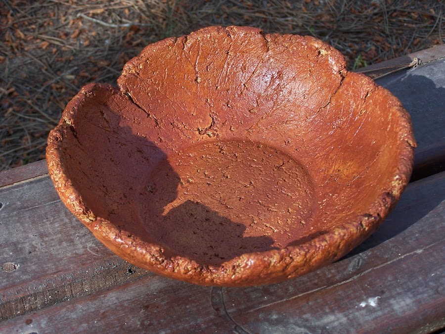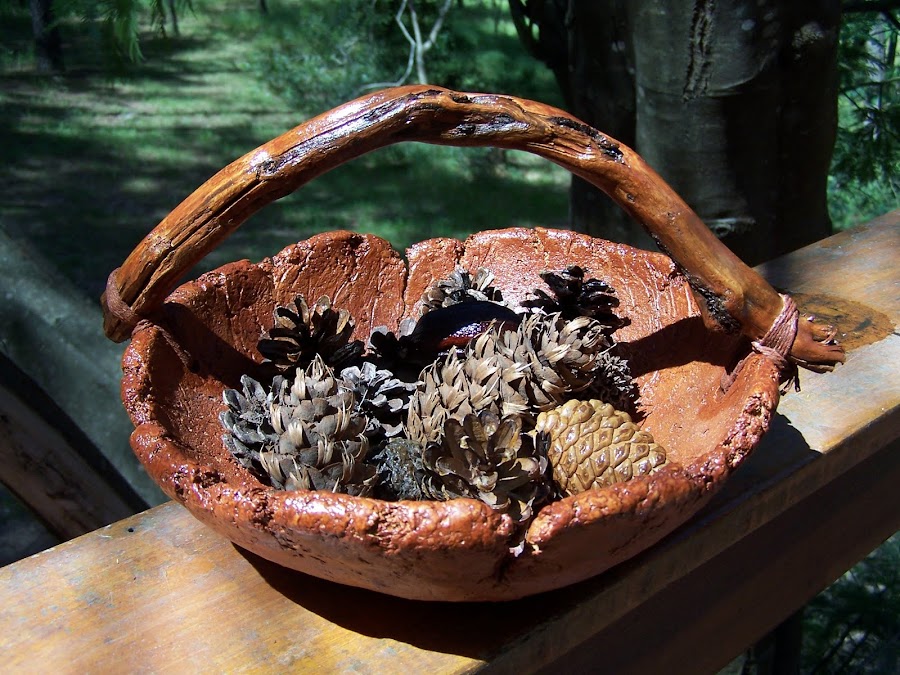 Trabajo terminado! Me gusta dejarlos como quedan cuando se secan, asi cada uno es un modelo unico. Le puse una tronquito que traje de un viaje a Bariloche como asa, atado con hilo de algodón que pinté con el mismo barníz al agua color roble claro que pinté el cuenco. Qué les parece? A mí me encanta, jajaja!!! qué poca modestia la mia!!