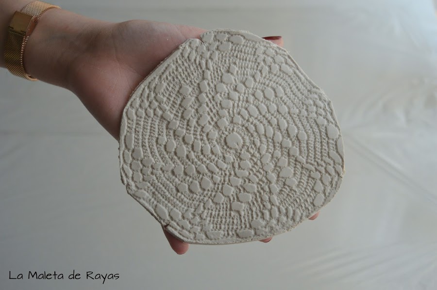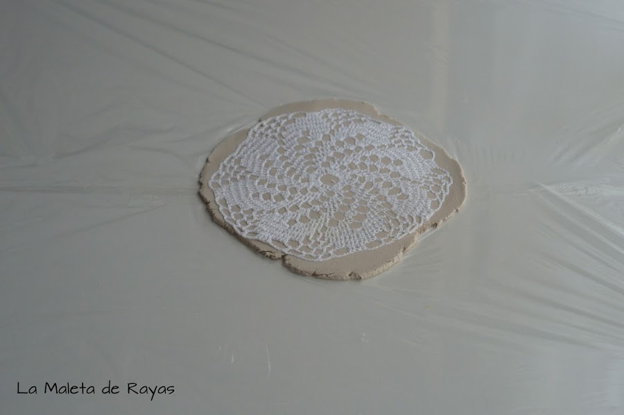 Cogemos un tozo de pasta y la extendemos con el rodillo. No la dejéis demasiado fina pero tampoco muy gorda. Cuando la tengamos extendida ponemos el pañito de ganchillo encima (o lo que queramos usar para que deje dibujado su forma). Pasamos el rodillo por encima hasta que quede integrado en la pasta de modelar.