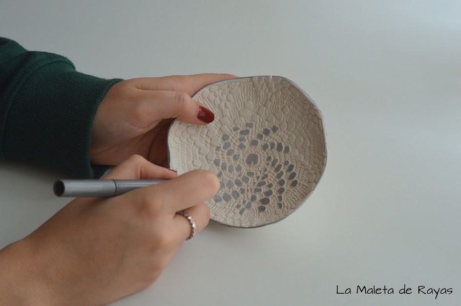 Una vez seco por completo lo podemos sacar del bol. Para que quede pulido y con mejor forma vamos a darle con un poco de lija de grano fino, sin pasarnos. Ligamos la parte de atrás y los bordes. Ahora vamos a decorar, y para hacerlo, he usado un rotulador en color plata y he pintado los relieves de dentro y el borde del cuenco.