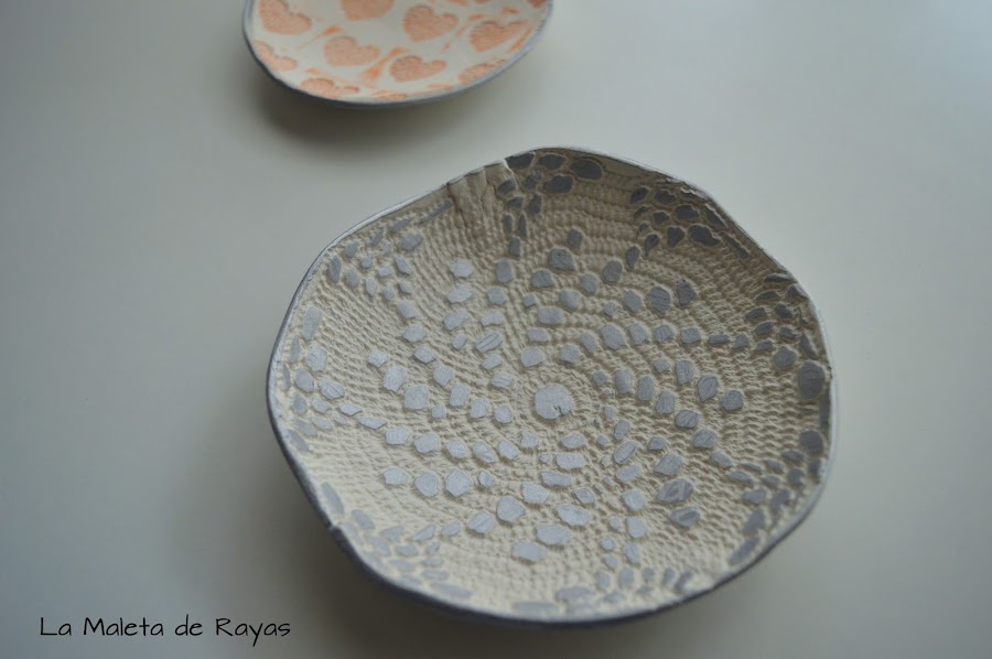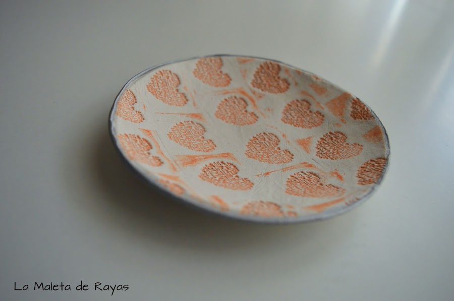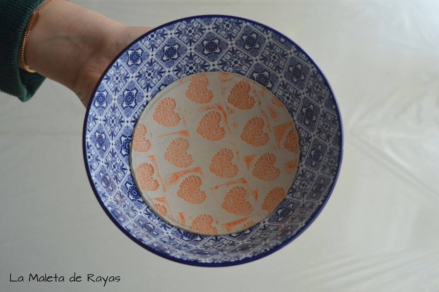¿Os gusta como queda? Aquí os dejo una foto de otro cuenco que hice más pequeño con otro sello de estampación diferente:
