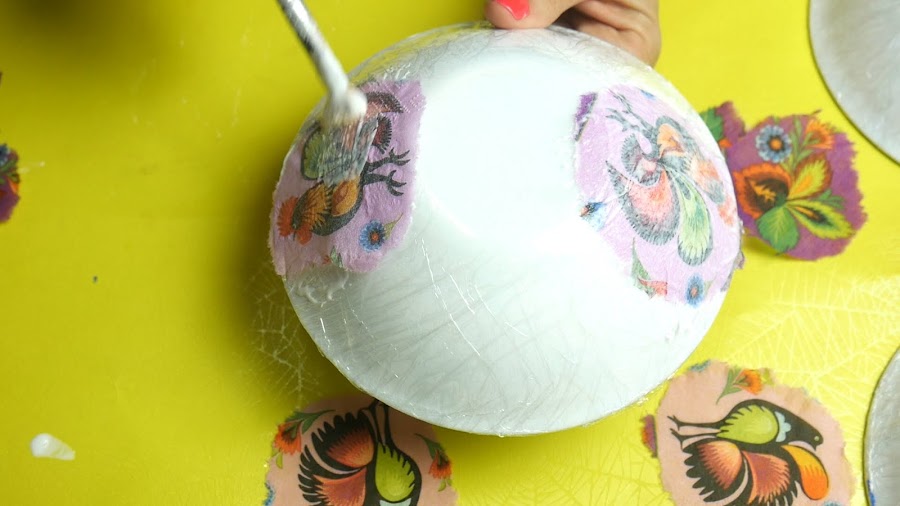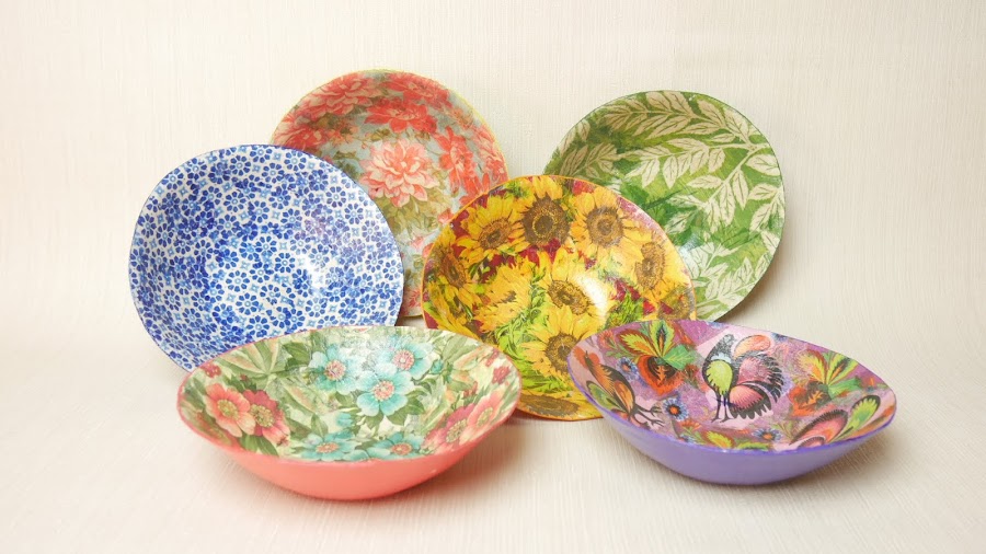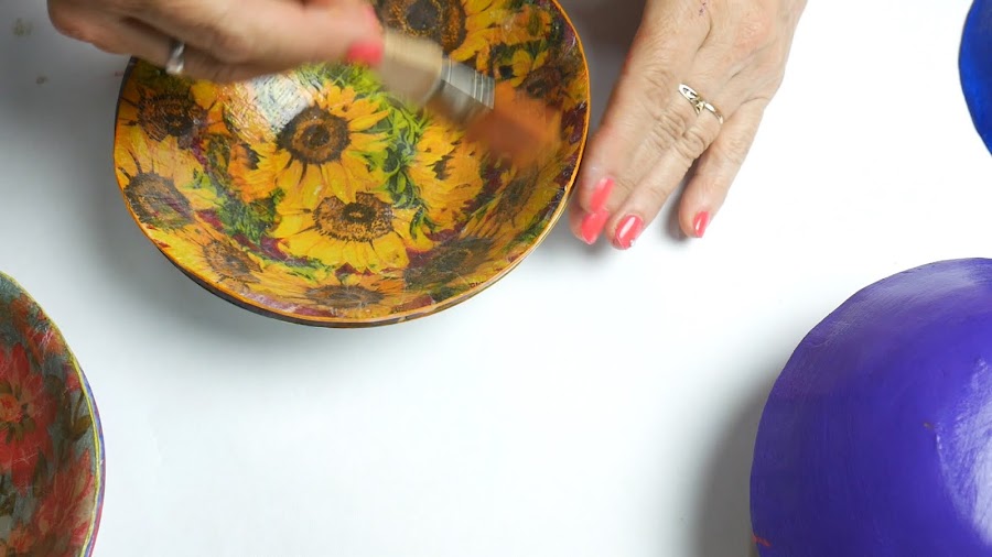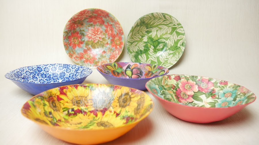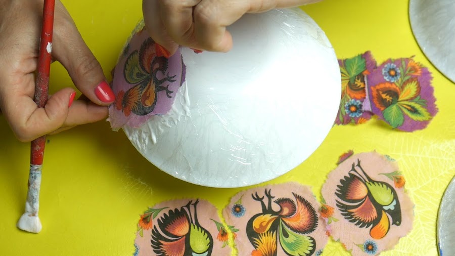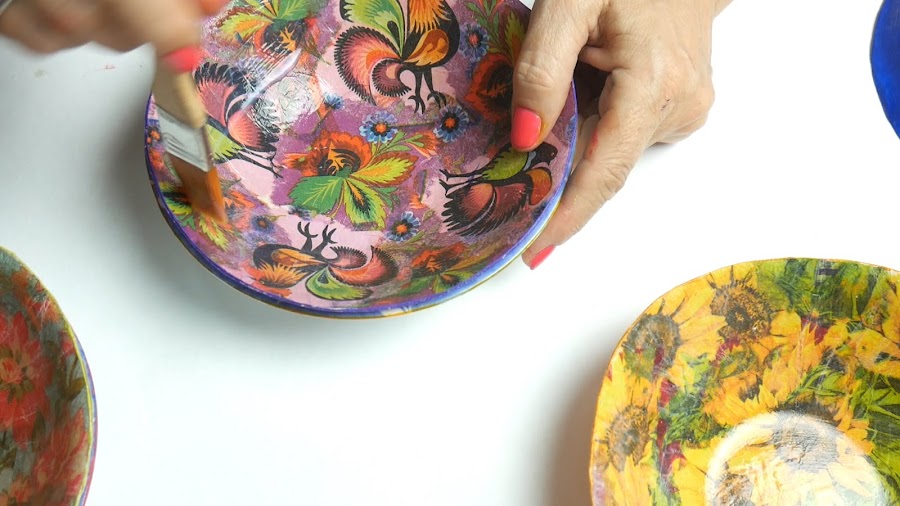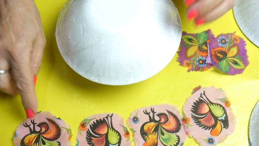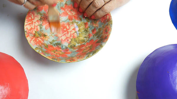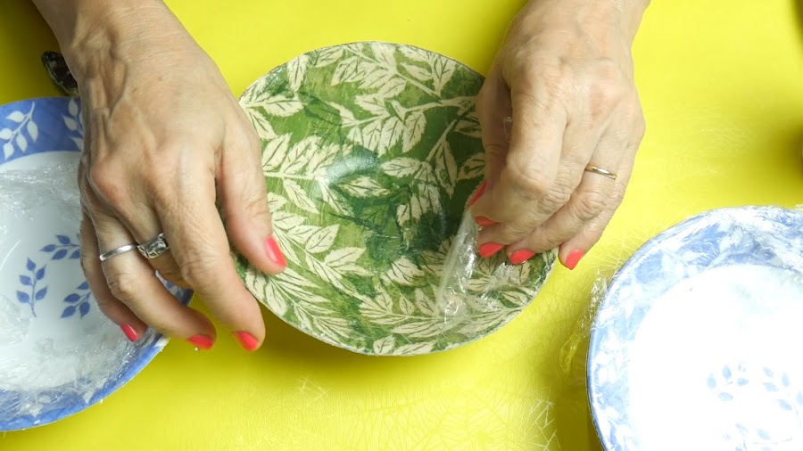 Film Adherente, Bols como molde, Servilleta de Papel, Cola Vinílica, Papeles de distinto tipo, Pinturas Acrílicas, Barniz Acrílico