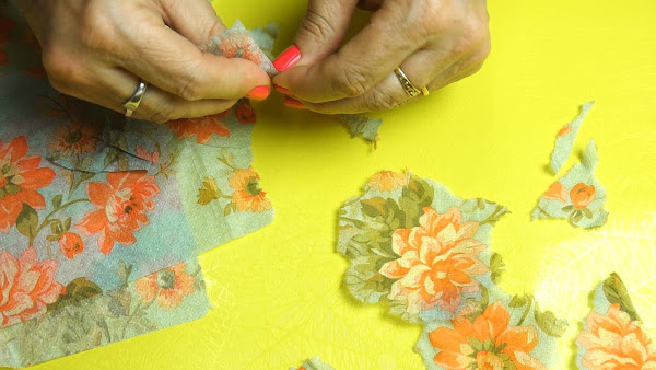 Otro ejemplo de servilleta, tiene flores grandes y pequeñas, separo las que quiero desgarrando alrededor las pongo a un costado para elegir al pegarlas