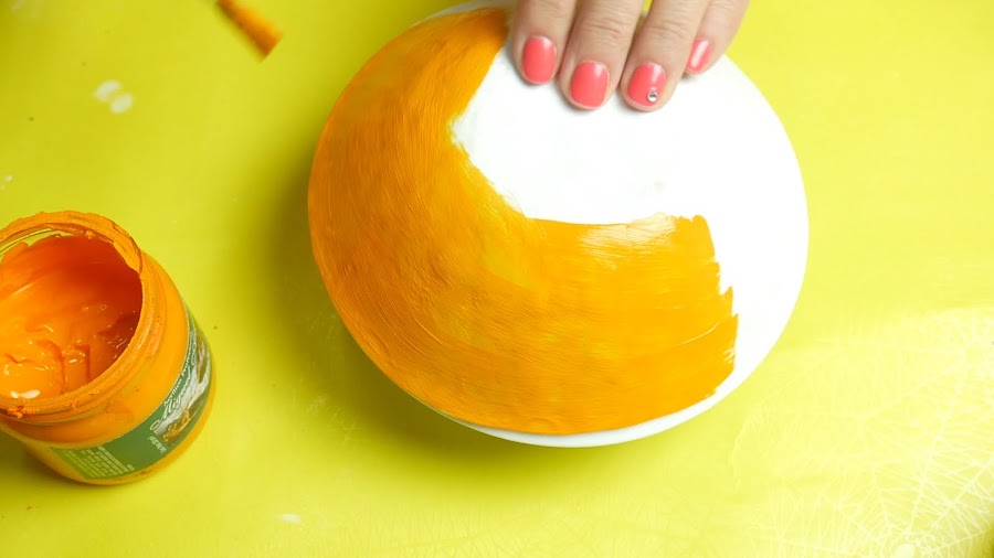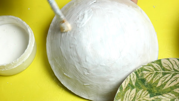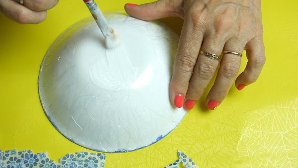 Comienzo por lo que sería la base del cuenco, aplico primero abundante pegamento con un pincel el pegamento que sea un poco espeso es mejor