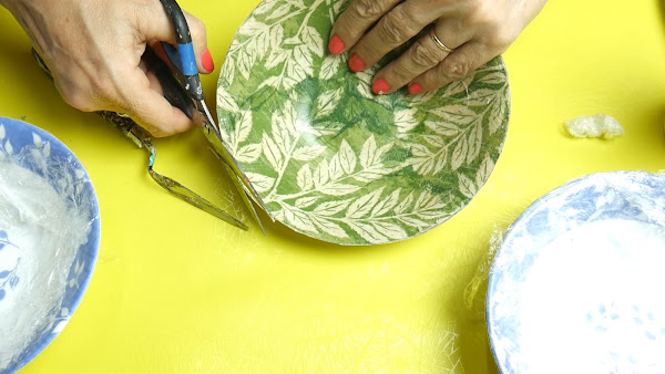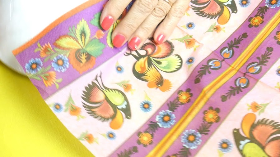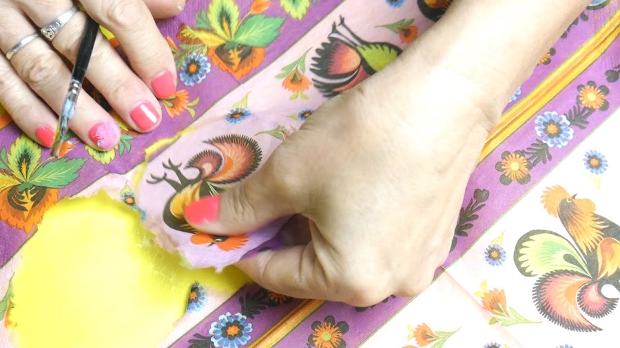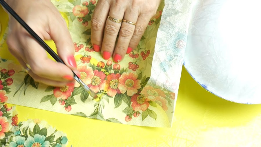 Al igual que en el decoupage eliminamos las capas lisas y recortamos la servilleta como cualquier papel para cartapesta