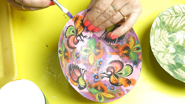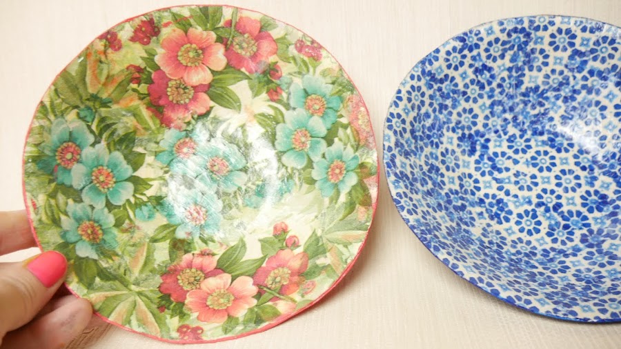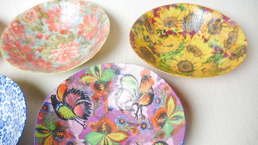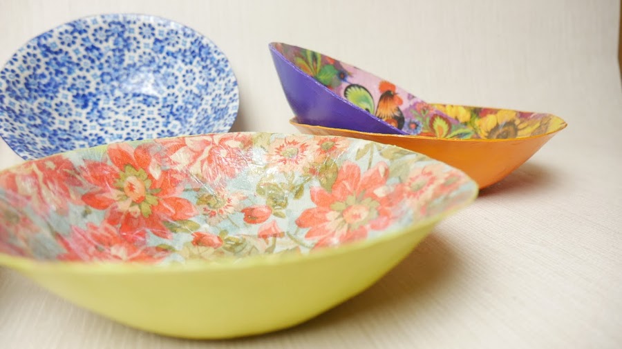 Están realizados con servilletas de decoupage que se incorporan a medida que realizamos la cartapesta y quedan plastificadas, por lo que se los puede limpiar con un trapo húmedo