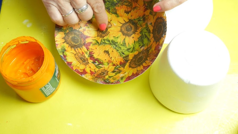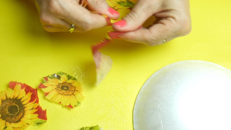Cuando los dibujos de la servilleta son más grandes tenemos otra oportunidad de diseño comienza aquí la creatividad, según el motivo por ejemplo éstos girasoles ya no puedo recortar en cualquier lado como en el anterior elijo separar las flores y le quito también parte del relleno