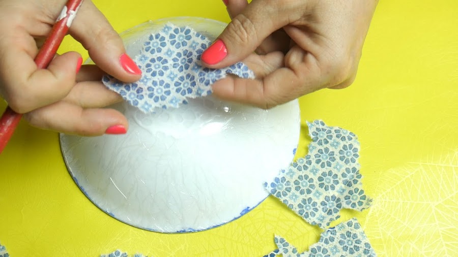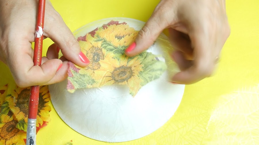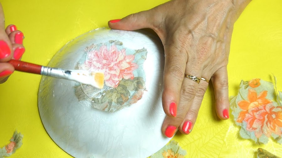 Elijo el trozo de servilleta a pegar teniendo en cuenta que la servilleta tiene un frente y un revés el frente de la servilleta es el que va a ir dado vuelta ya que va a quedar hacia arriba cuando lo desmolde apoyo la servilleta y le aplico más pegamento con cuidado de no romper el papel.