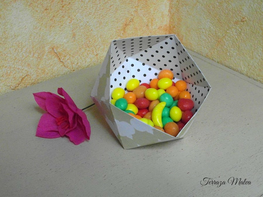 Son muy fáciles y rápidos de hacer y lo único que necesitamos es cartulina y pegamento. Yo he utilizado cartulina de scrapbooking decorada por las dos caras y el contraste entre el estampado interior y el exterior de los cuencos queda muy bonito.