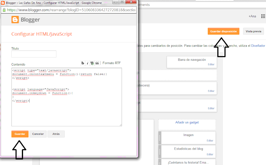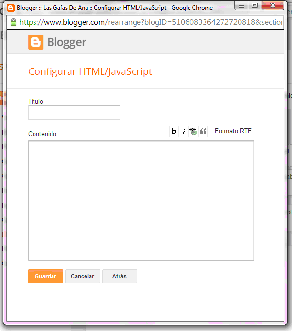Cambiara la ventana y en "contenido" pegamos el siguiente código: