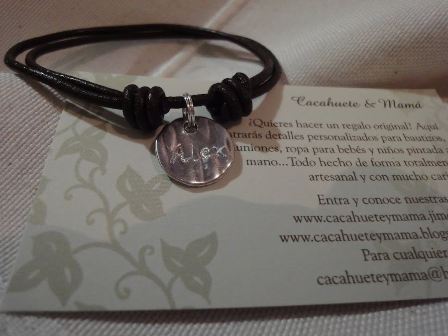 Es muy muy cómoda, y muy sencillita. Se abre y cierra con los nudos corredizos. Está hecha con una medalla de15mm, bañanda en plata y cuero de 2,5 mm.