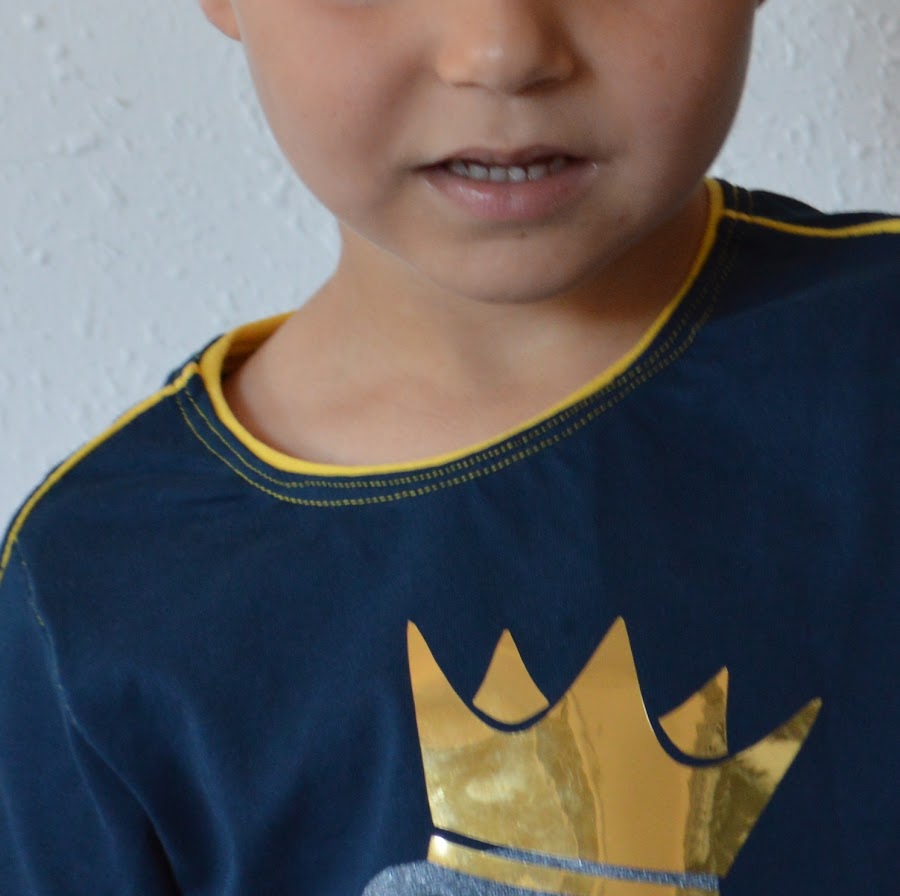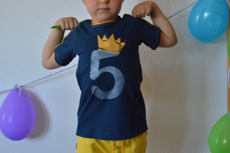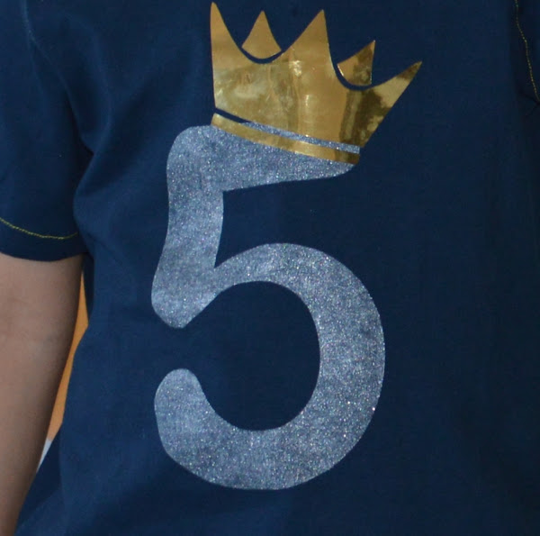 Y la guinda del pastel es el tuneo que me he marcado... Un 5 con espray textil (plantilla con aironfix como hice en la bolsa porta zapatos) y la corona con vinilo dorado plotteralia. Me chifla como queda y a mi niño todavía más, a pocas prendas le ha dicho que le mola mucho...