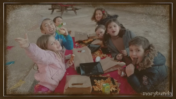 Después de un rato jugando cada uno se comió su merienda. La solemos poner en bolsitas individuales para que lo que no se coman lo guarden para más tarde. Y la tarta, una verdadera obra de arte de la gran Jo Pepamia en dulce, artista más que repostera, y totalmente recomendable. Además de ser espectaculares, sus tartas están para chuparse los dedos.