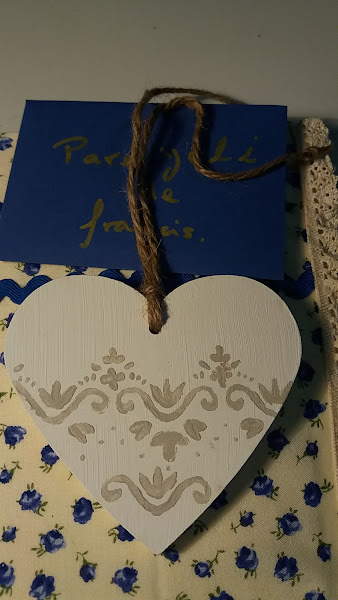 Este corazón de madera pintado en blanco merengue y con un estarcido en beig antiguo, lleva por detrás la Y de tu inicial.