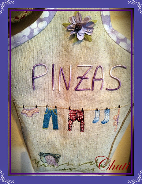 Como a la mayoría de las que andamos por aquí, siempre me gusta obsequiar a mi gente con algo hecho por mí, y si es mi madre, con más motivo porque sé seguro que acertaré con lo que sea. En este caso, he hecho esta bolsa de pinzas que he visto en varias ocasiones por la blogosfera, le he bordado a máquina las letras y la ropita, uuuumm.... lencería, vaqueros, camisa a cuadros... yo creo que debe pertenecer a una jovencita muy campestre, no?