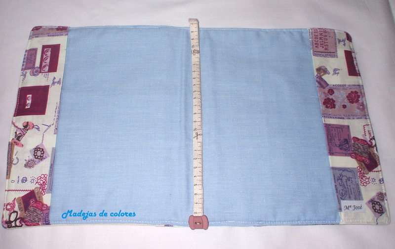 Como forro, una tela celeste y como marcador, una cinta métrica, en cuyo extremo puse un botón en forma de bobina.