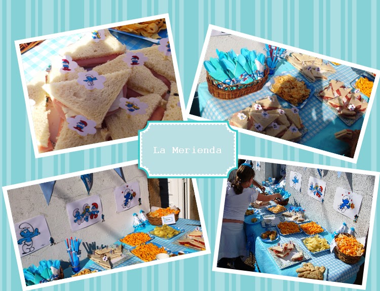 La merienda?, llena de cosas ricas para los niños y algo también para los más mayores, estaba invadida de pitufos en forma de banderillas, servilleteros, pajitas o platos.