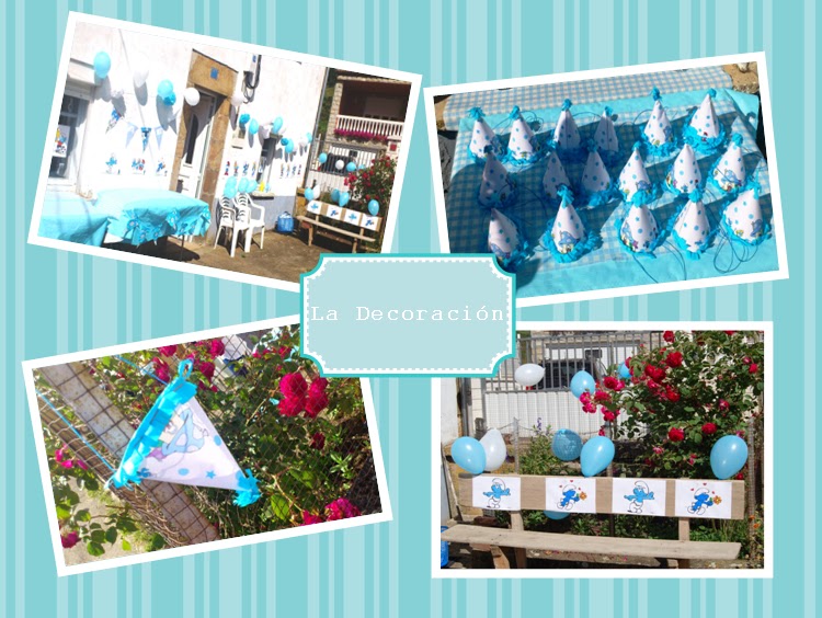 Empezamos por la decoración... gorros de fiesta, globos, pompones, guirnaldas, dibujos...todo ambientado en azul y blanco y en aquellos diminutos personajes.