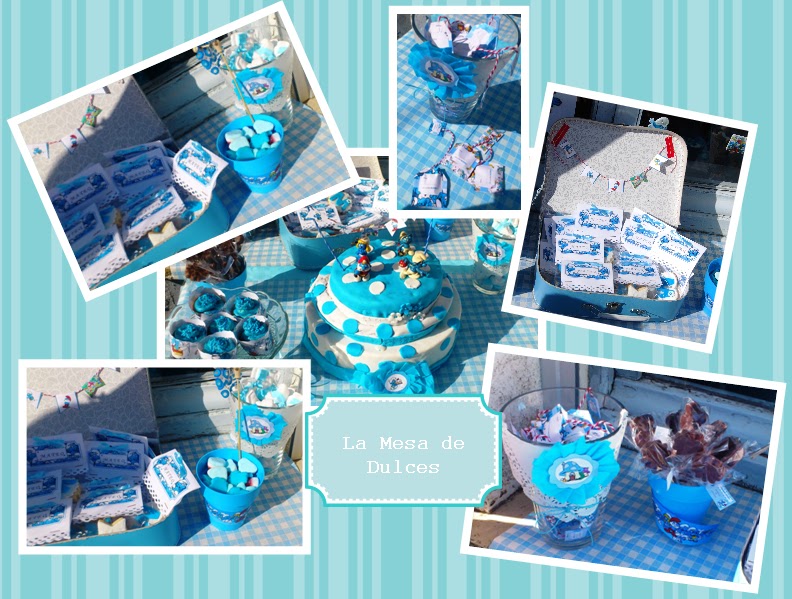 La deseada mesa de dulces tenía galletas decoradas con la inicial del niño, cupcakes, piruletas de chocolate, pequeños pitufos de nubes, "tea bags" rellenas de caramelos, y muchas chuches.... y todo cuiadosamente decorado con envoltorios o pequeños detalles de los pitufos.