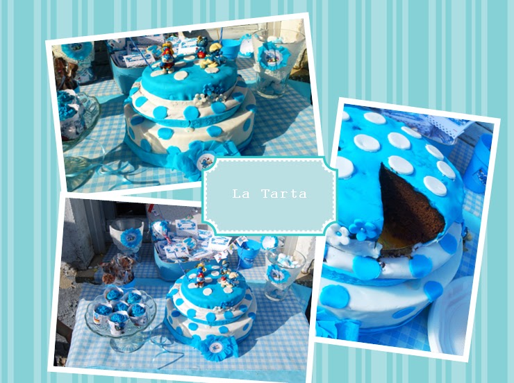 La tarta... una riquísima torre de tres pisos de bizcocho de chocolate cubierto de fondant azul y blanco coronada por Papá pitufo, la pitufina y un pitufo juguetón. Para ser la primera vez que la hacía, quedó bantante bien aunque tengo que reconocer que no es tan sencilla como a primera vista parece. Eso sí, no sobró nada de nada.