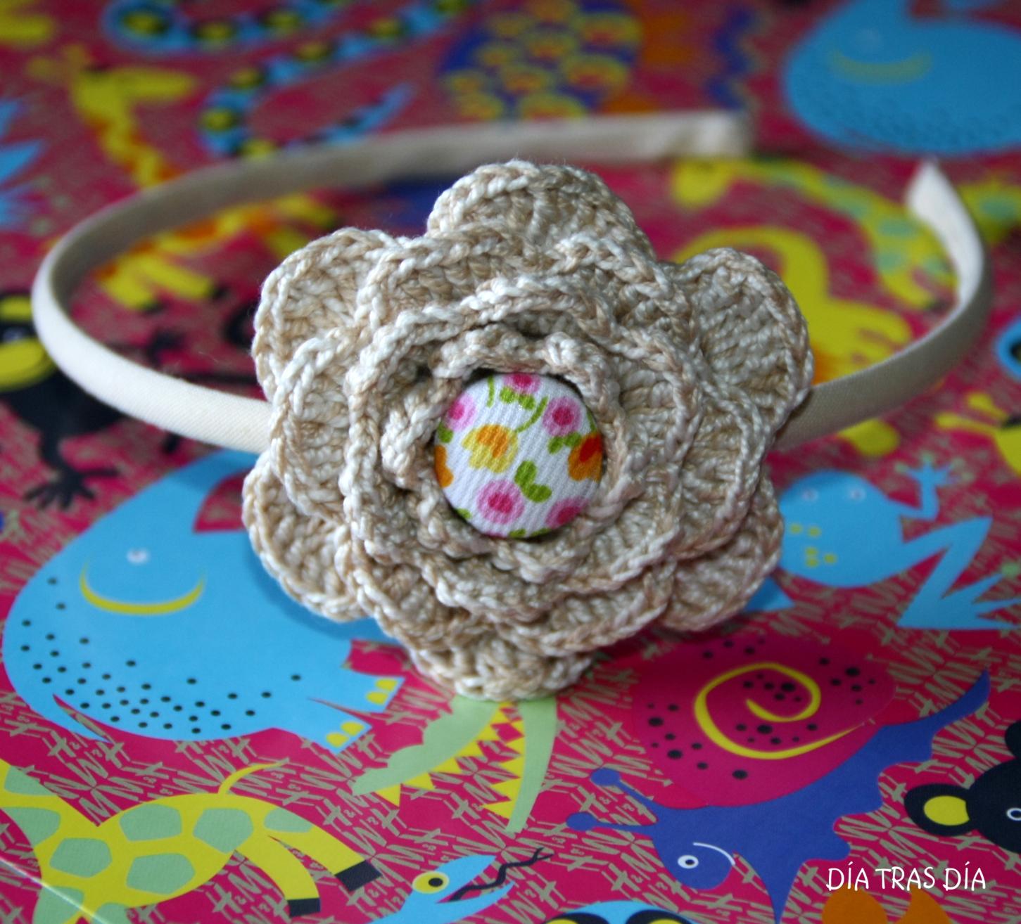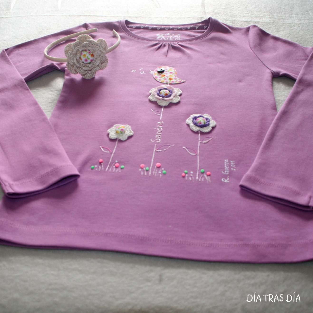 Además, para formar un conjunto, hice a juego un coletero con una flor de crochet igual que las que lleva la camiseta.