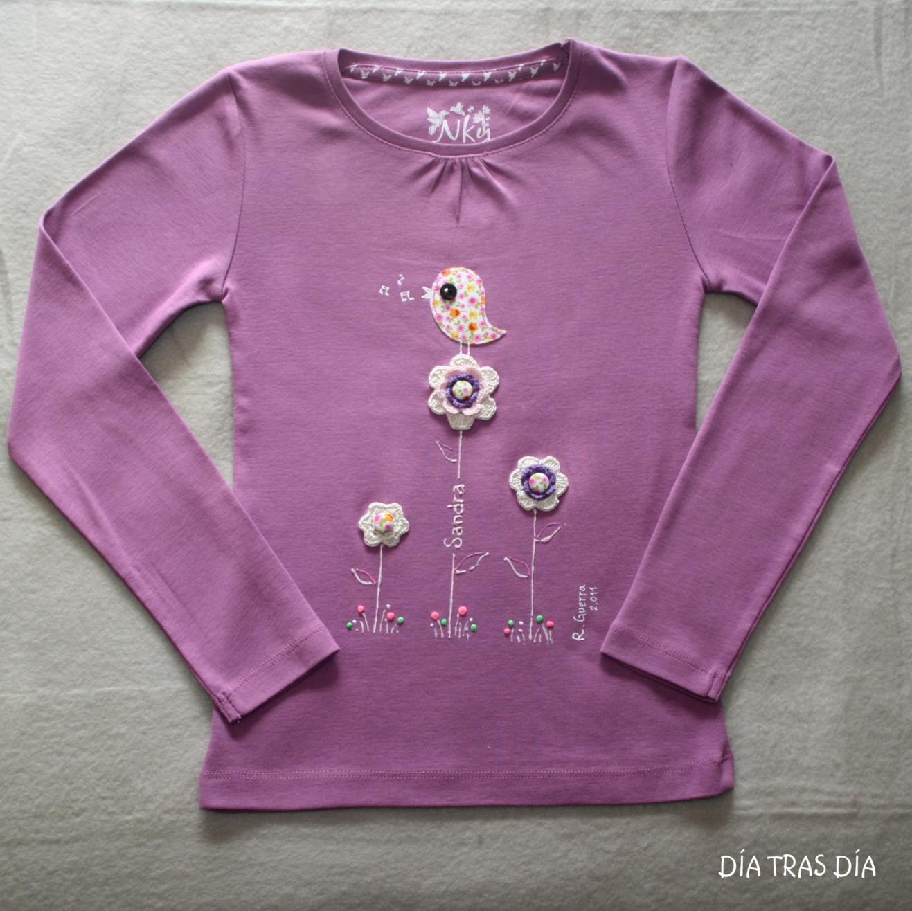 Hay que decir que parte del regalo fue hecho según indicaciones de Iván, ya que me dijo que quería que le regalásemos a Sandra una camiseta en color morado o rosa, que estaba seguro que en esos colores le encantaría, que fuese con el modelo "Observando desde las flores" y que además llevase puesto su nombre en la camiseta.