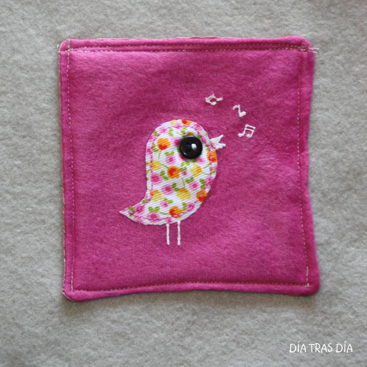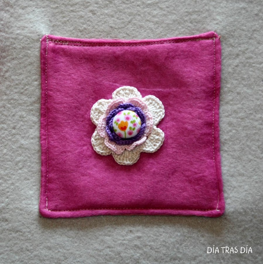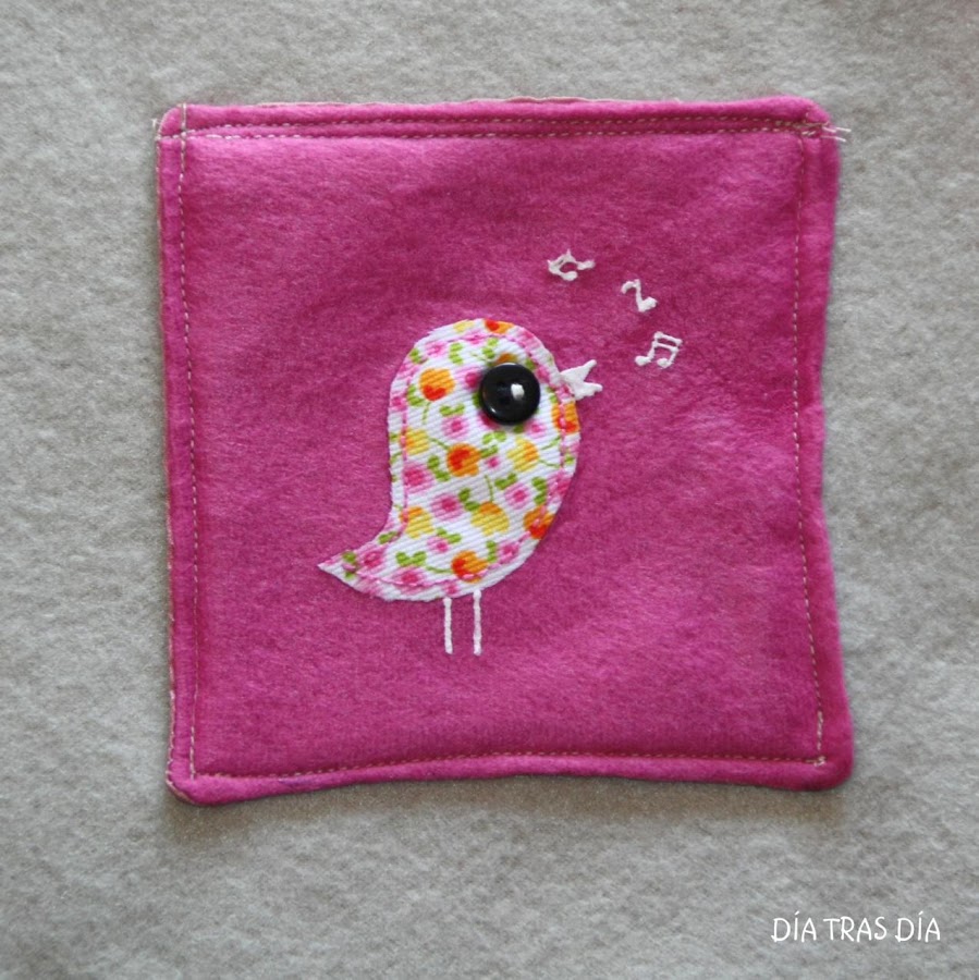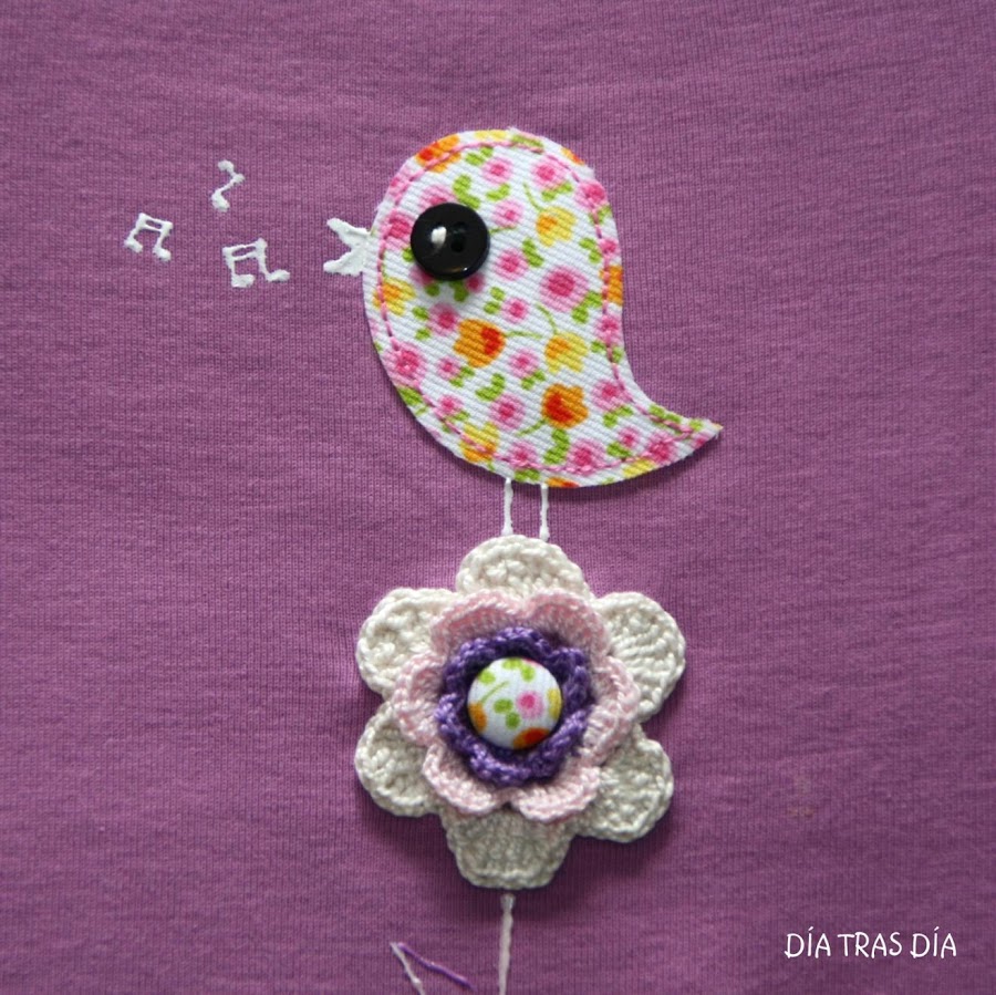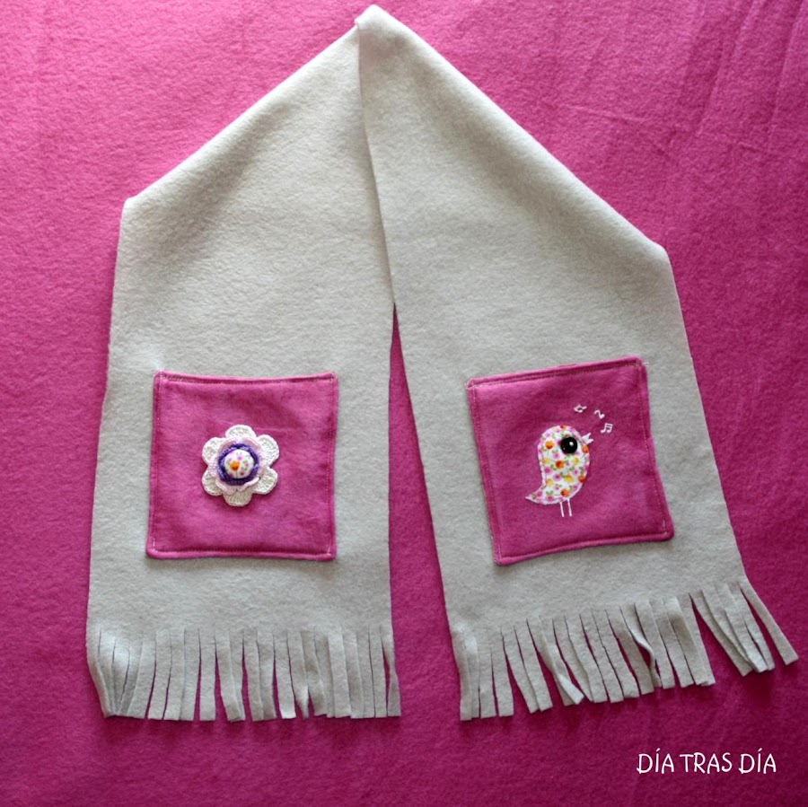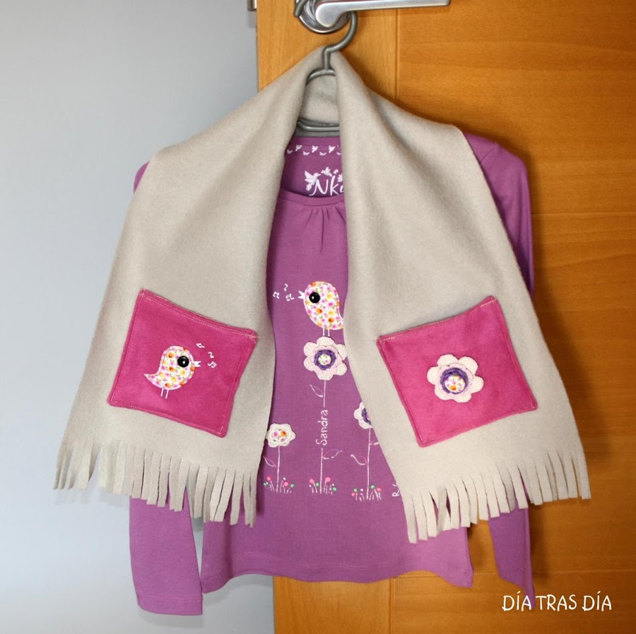 Y así es como salió esta bufandita con bolsillos, que pueden servir para guardar un pañuelo en esta época tan propia de estar resfriados, como de meter en ellos pequeños tesoros... Y para que fuese a conjunto también con la camiseta, la decoré con los mismos motivos: el pajarillo y una flor.