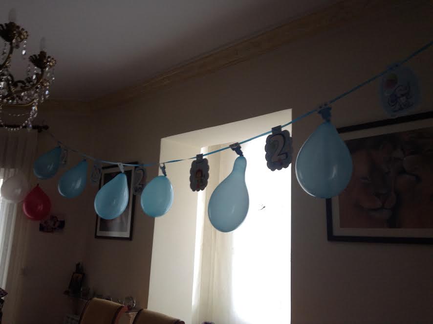 guirnaldas de 5metros que cruzaban el salón...con cartelitos de 2 años,dibujos y globos