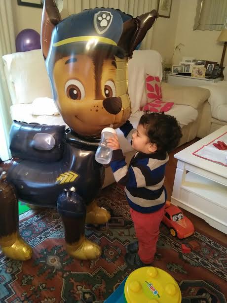 y aquí tenéis a mi piratilla de dos años compartiendo el biberón de agua con su perro de la patrulla canina...lo paseo por toda la casa.