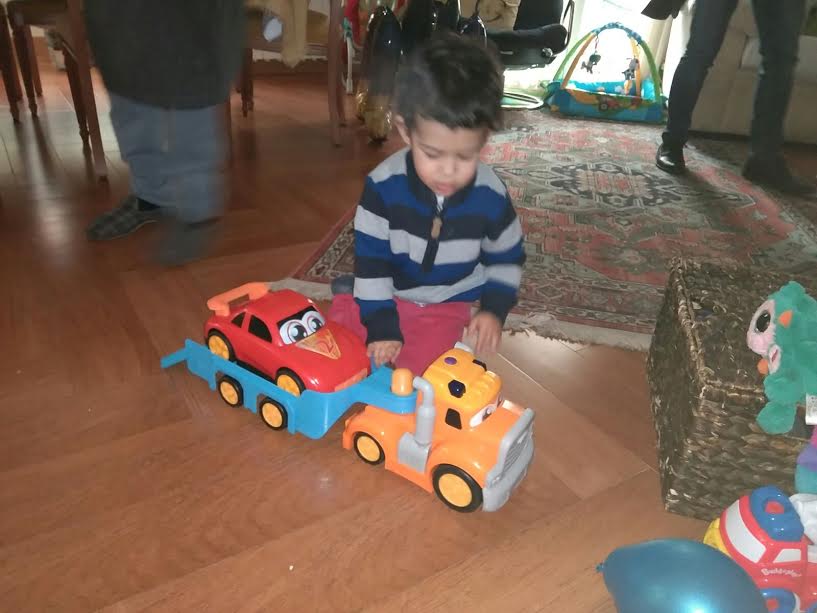 Le encantan los coches y si ademas los tios lo llenan con huevos kinder y chocolatinas ya es lo mas.