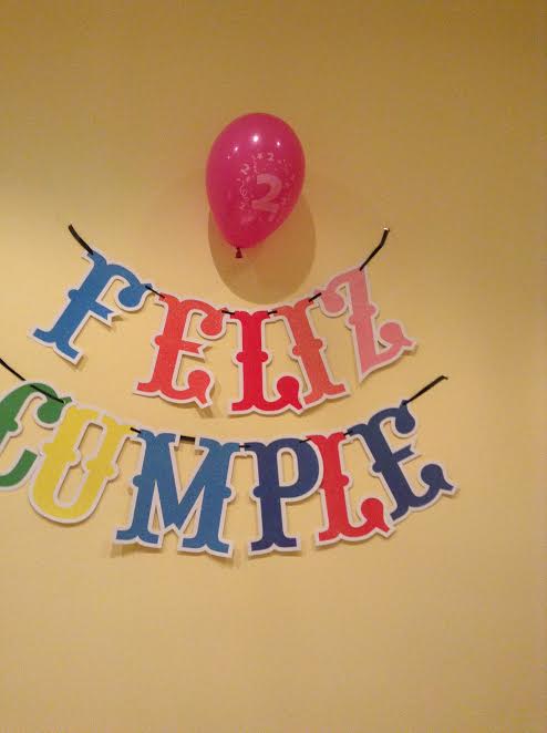 No podía faltar el cartel de FELIZ CUMPLE con su globito de 2 años