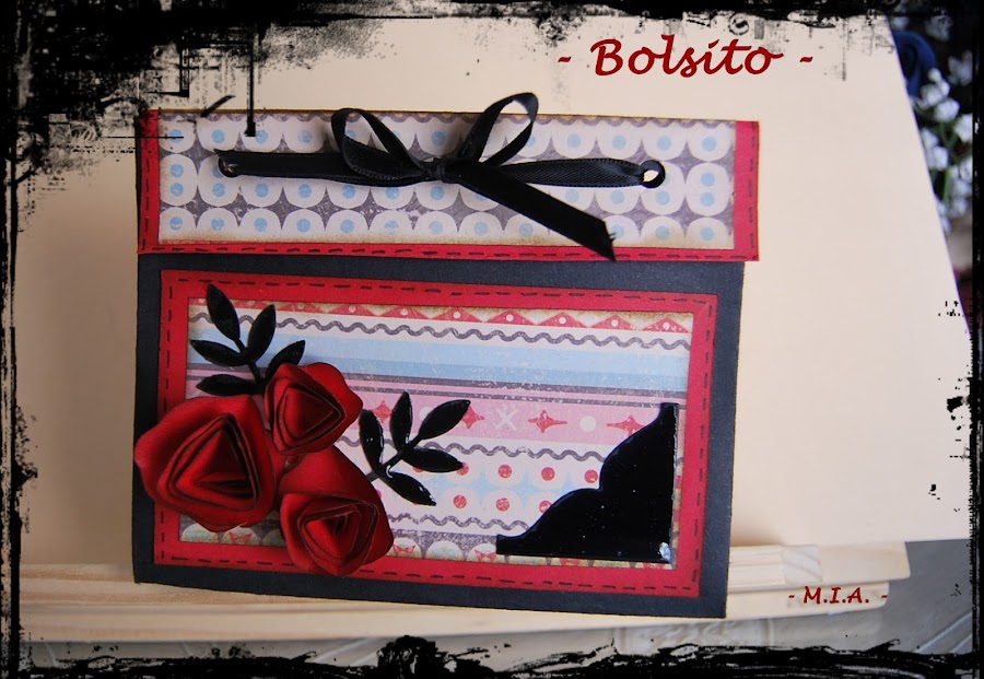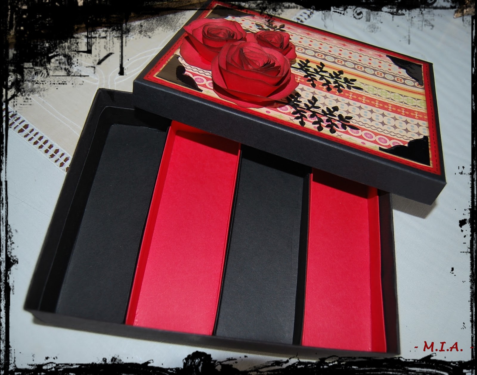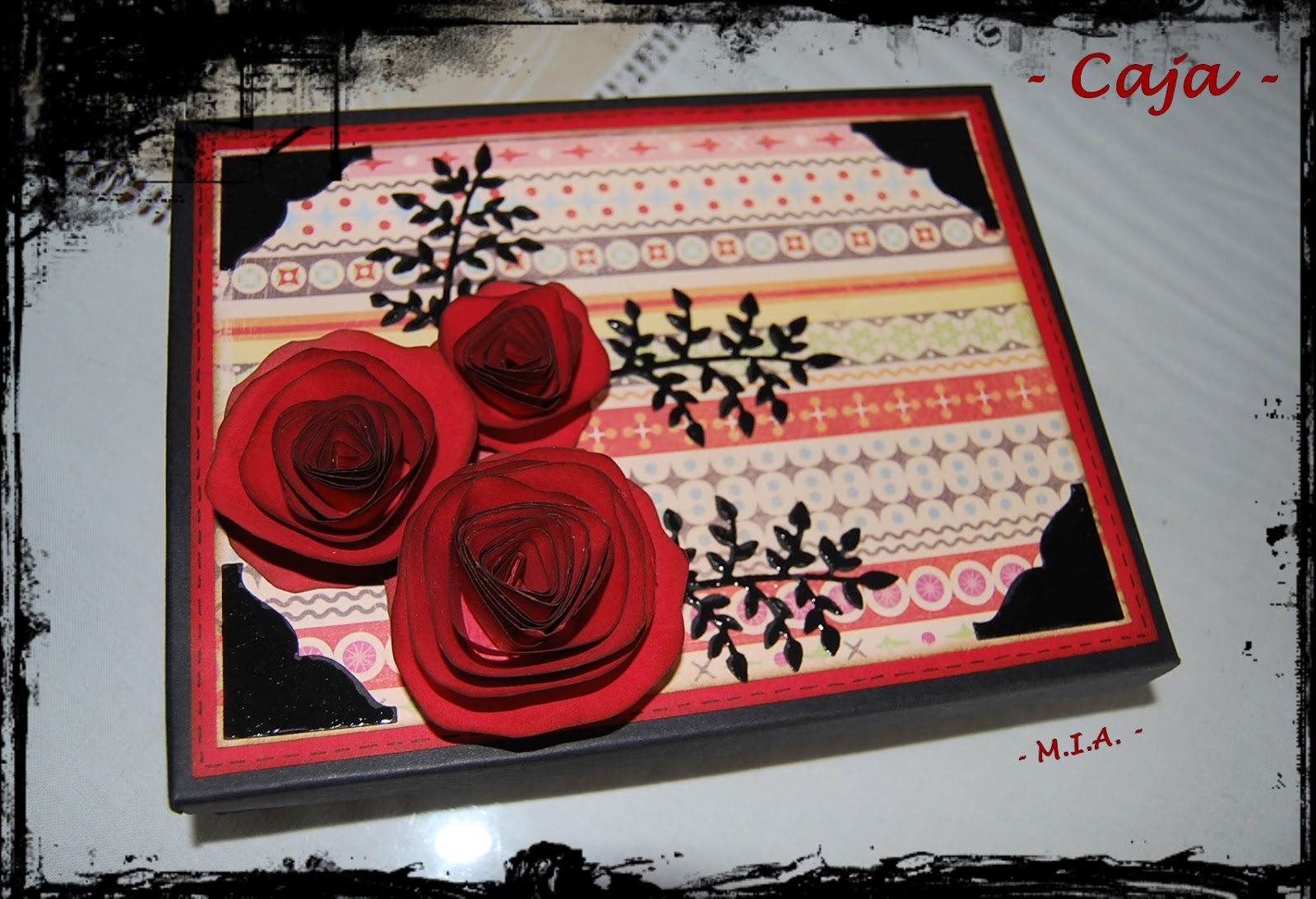 Le hice una caja organizadora con cuatro cajones interioes. Las rosas son caseras y recortadas a mano. Los esquineros tienen un capa de glossy acent, lo mismo que las hojitas troqueladas negras...