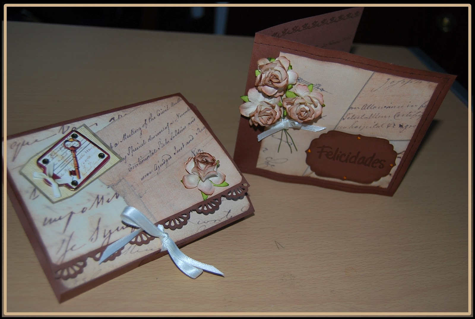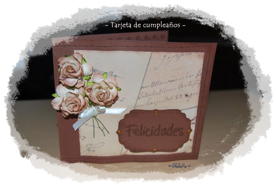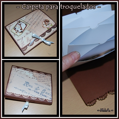 Le hice una carpeta con bolsillos en los que metí unos cuantos troquelados. Usé cartulina marrón como base y luego uno de escritura en los mismos tonos. Los bordes estás hechos con troqueladora EK Bordes Pointes Flowers Edge y las flores son Brown mulberry paper wild roses. Un pequeño lazo de satén sirve para cerrar la carpeta.