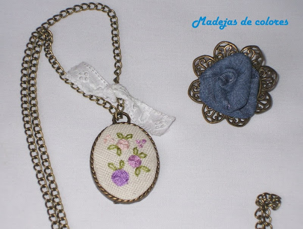 Le hice un colgante a juego, con un anillo que había hecho anteriormente, con un bordado de flores, le puse cadena rematada con un trocito de puntilla y un anillo con una flor vaquera.