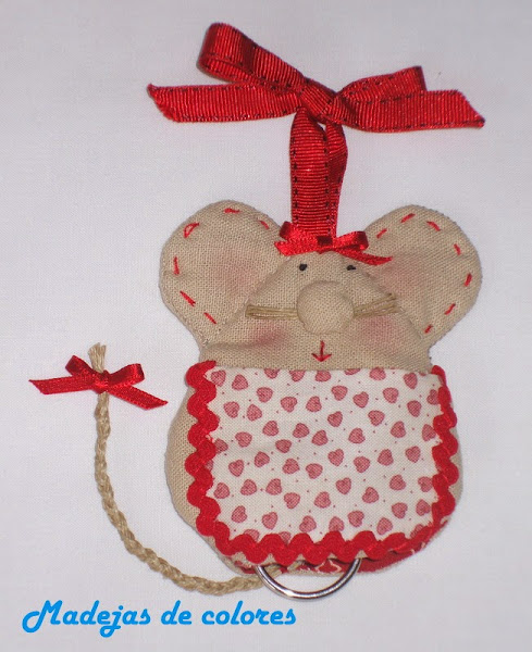 Y para terminar el famoso ratoncito llavero, que ya todas conocéis. Pero al que modifiqué algunas cosas, como la cola, la cual puse hacia arriba para que no moleste al sacar las llaves y en lugar del corazón al final de la cinta, terminé esta en un lazo.