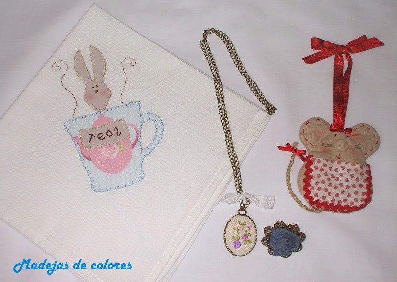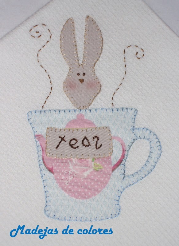 Volví a repetir el paño de cocina con la taza y conejito de Tilda, con aplicaciones a festón.
