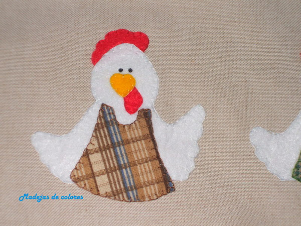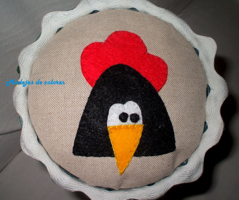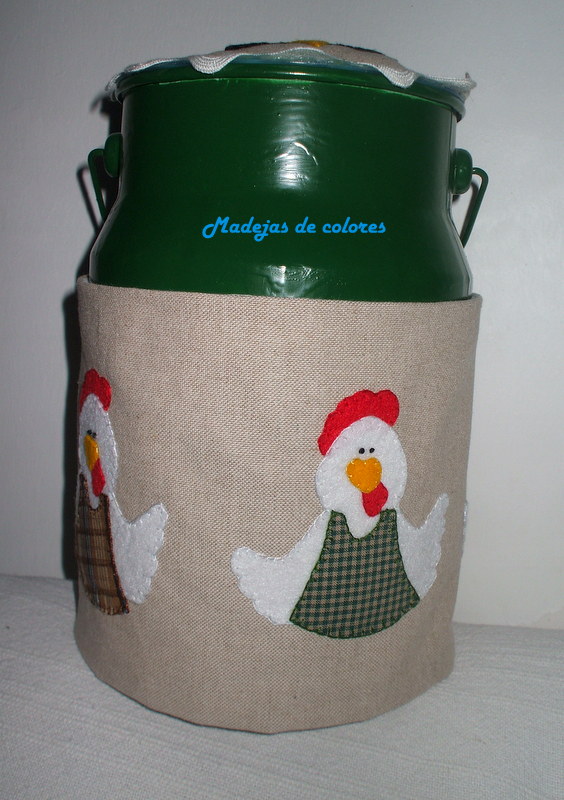 Tenía rondando por casa, una lechera que venía llena de chupa-chups. No es muy grande, pero le viene genial para la cocina pequeña que tiene en la terraza para cuando hace barbacoas. Esta es en tonos verde y estilo antiguo, así que la pinté así y le hice una funda llena de gallinas con aplicaciones.