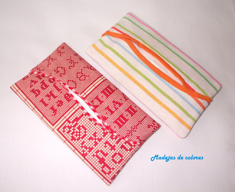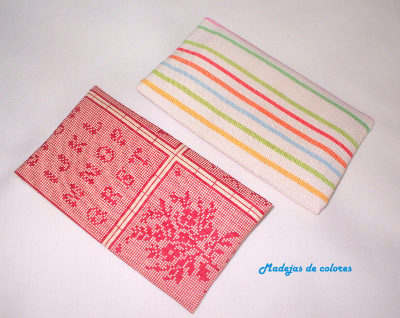 Y por último, unos guarda-pañuelos con un cierre con forma original, así como la tela, cálida como a ella le gusta, con gráficos de punto de cruz en un rojo oscuro y de forro una de cuadritos rojo y blanco. La otra alegre de fondo blanco y rayas de colores y de forro un naranja.