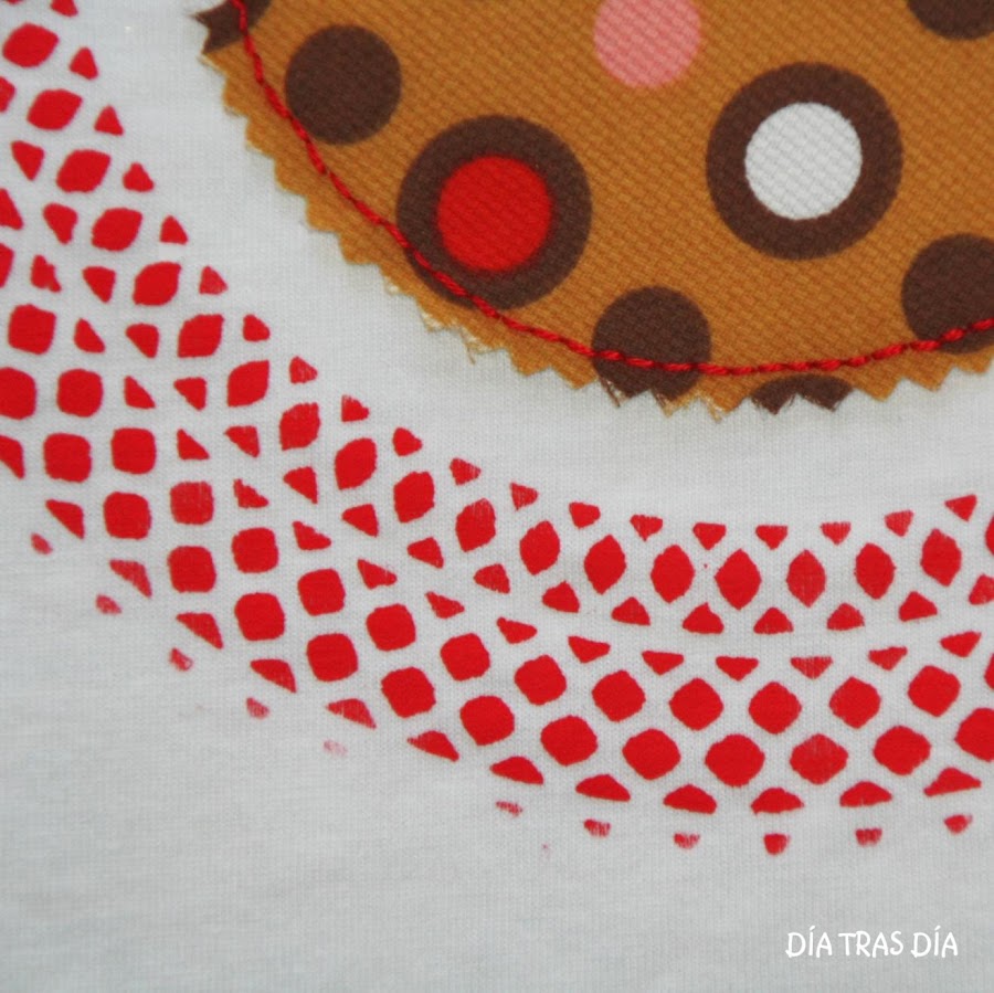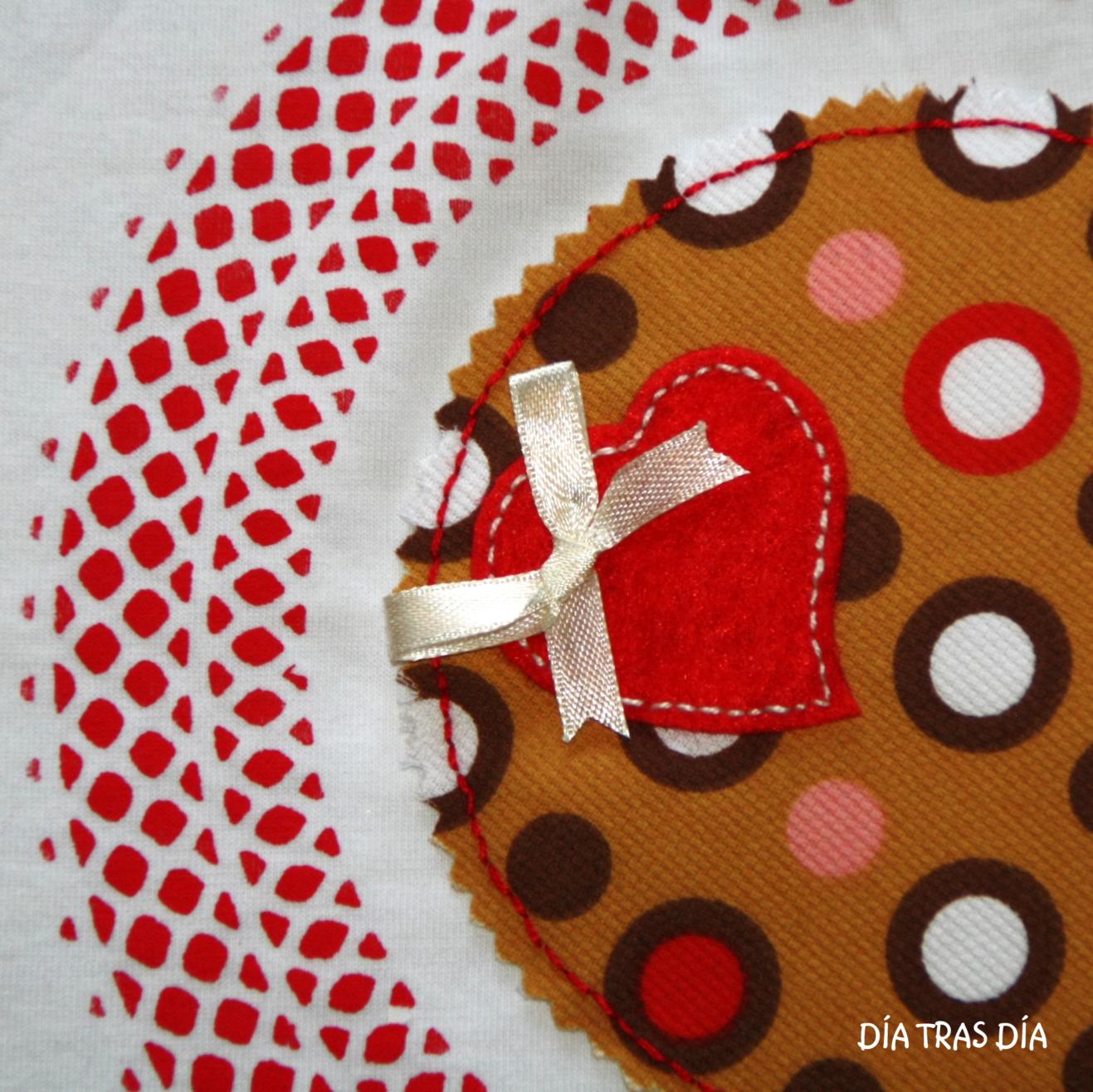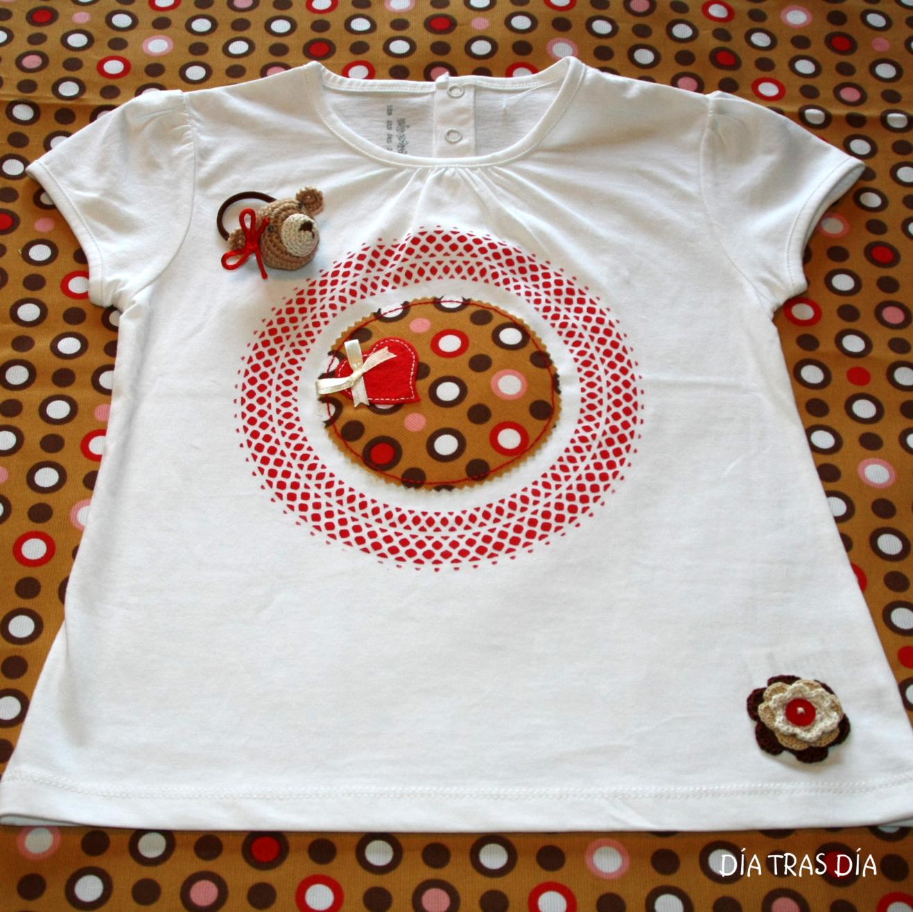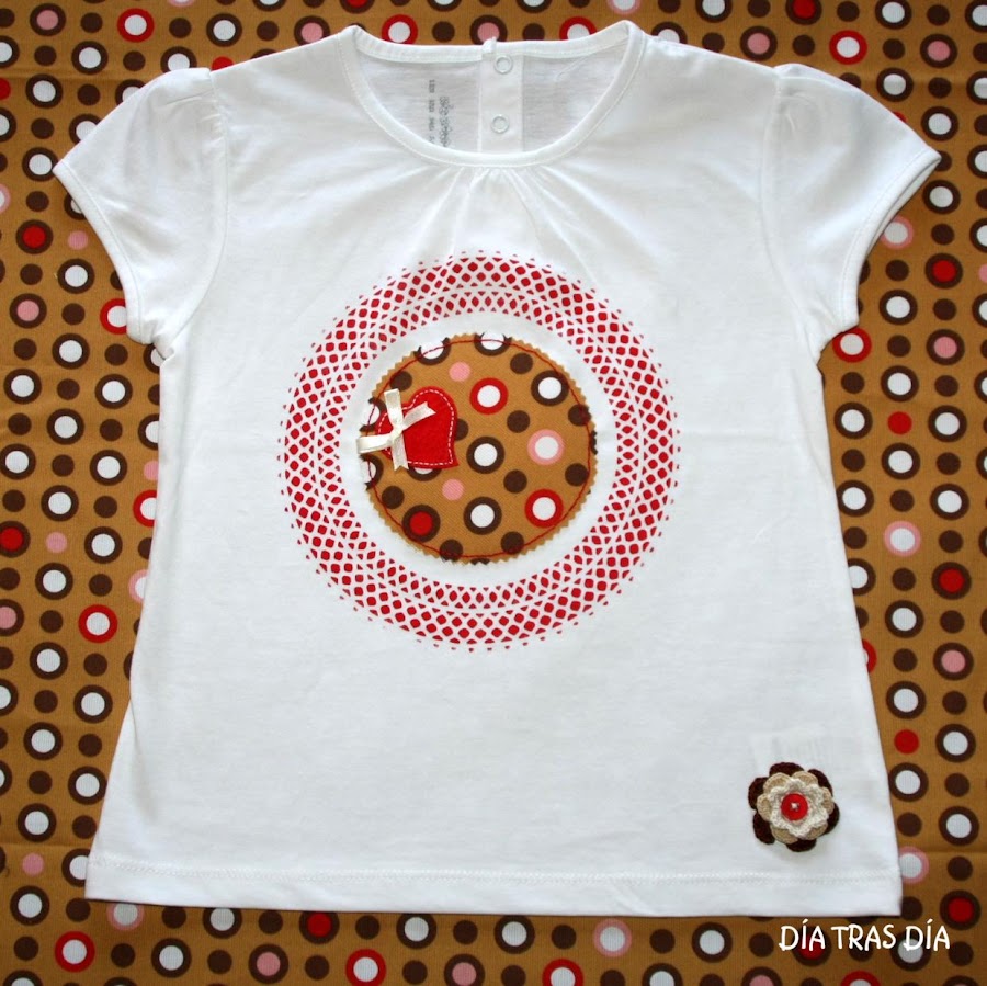 Para la otra camiseta, en manga corta, he elegido un modelo que se me ocurrió sobre la marcha y en la que puse en práctica un nuevo invento. El diseño de la camiseta es sencillo, con un aplique de un corazón de fieltro sobre un fondo de tela estampada. El toque original, he pretendido conseguirlo con el detalle del adorno que rodea al corazón, realizado mediante la técnica del estarcido, empleando para ello una blonda de papel del que se usa para poner como base en las tartas. Al final el invento salió bien, en la medida en que no he estropeado nada ni ha ocurrido ningún accidente ;-).