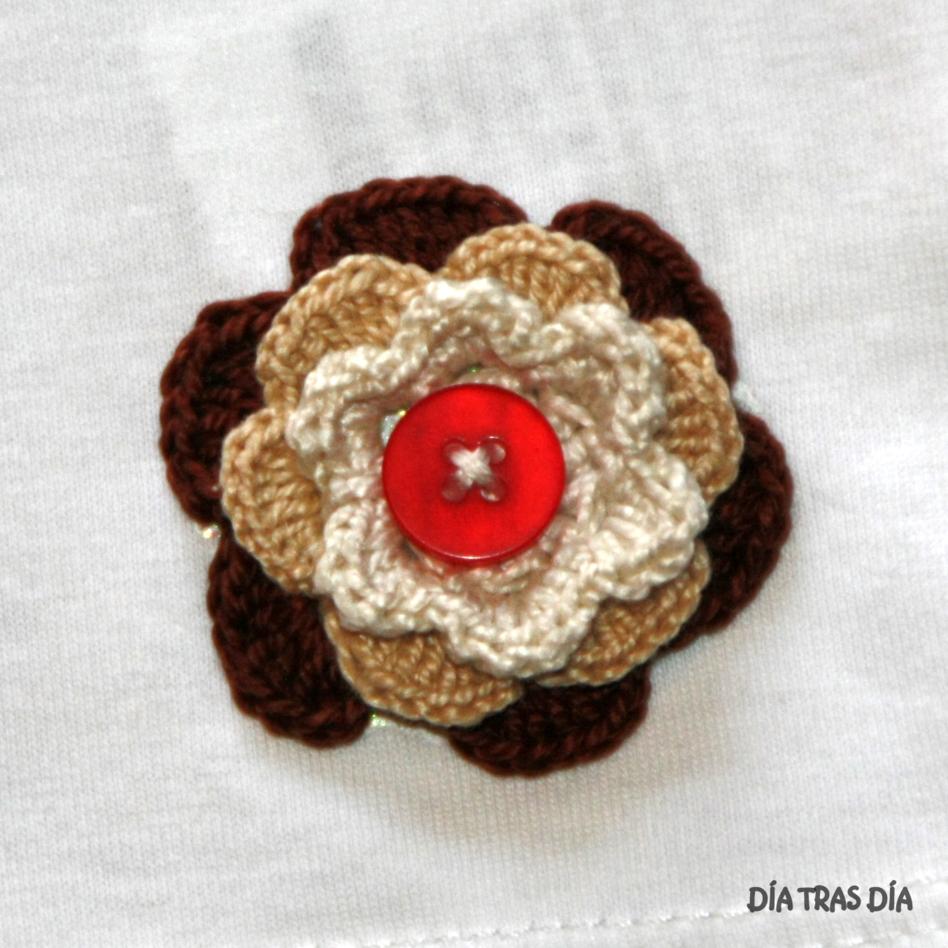 En la esquina inferior de la camiseta, se me ocurrió ponerle un detalle de una flor de crochet, para que no todo el dibujo se quedase en el centro de la camiseta