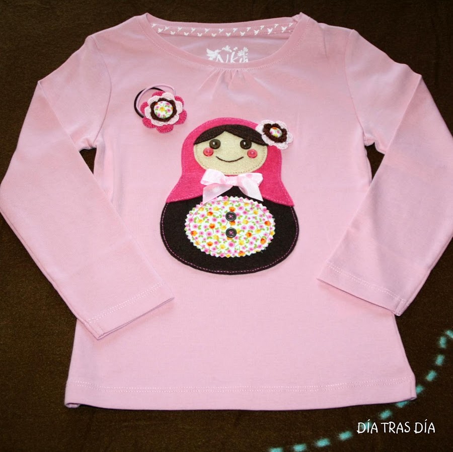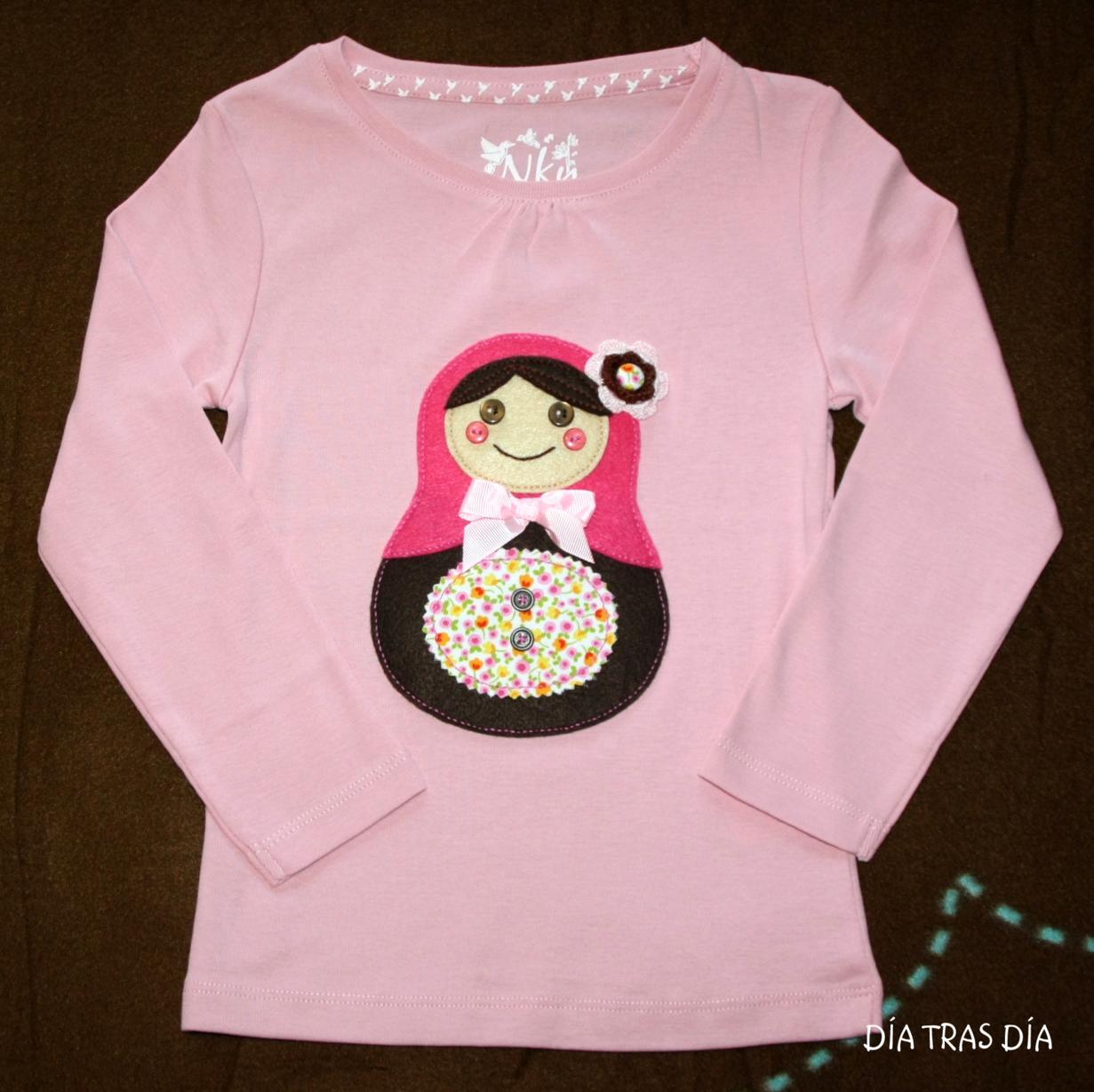 Una de las camisetas es de un modelo más que conocido, porque ya he hecho muchas anteriormente, aunque en la medida de lo posible, intento que no se repitan cambiando alguna cosa ;-). En la camiseta de manga larga, le he hecho una Matrioska, que podéis ver en estas fotos: