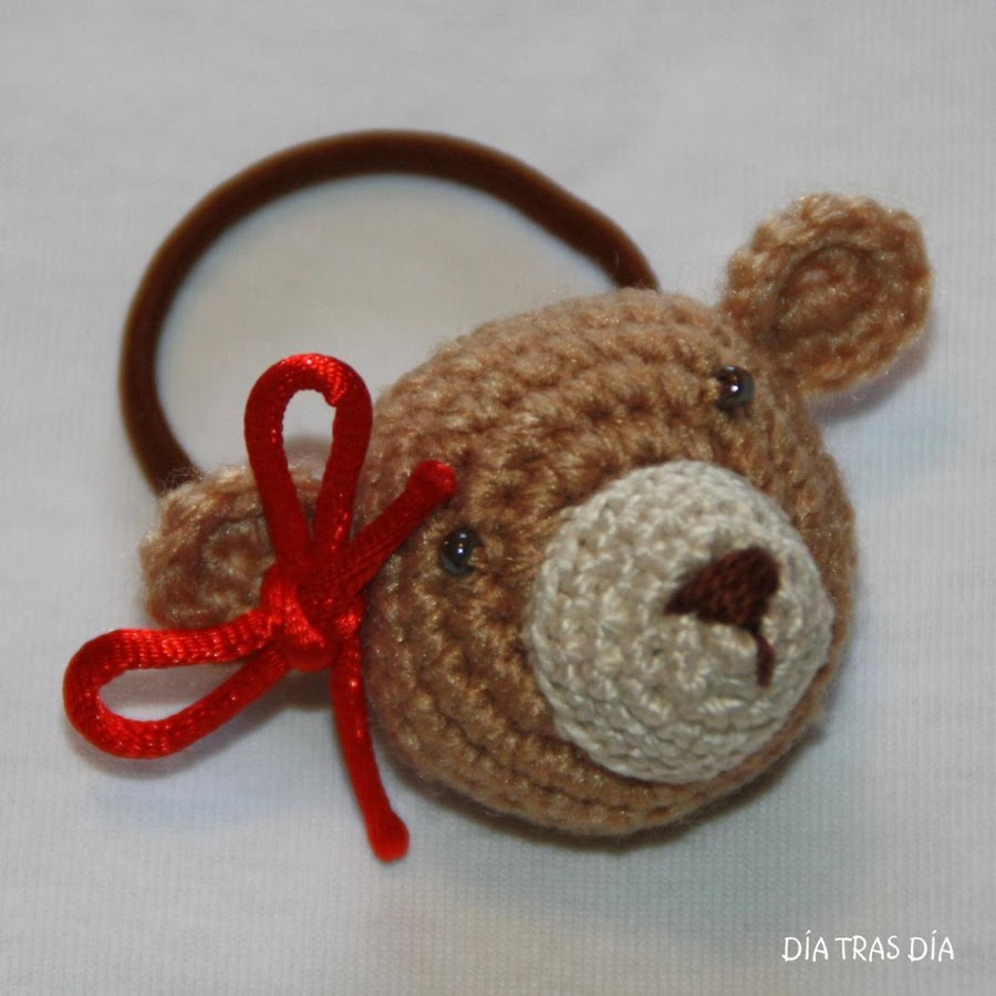 Y a juego, empleando los mismos colores, he realizado un coletero con cabeza de osita, muy coqueta ella con su lazo y todo, que creo que ha quedado muy resultón ;-)