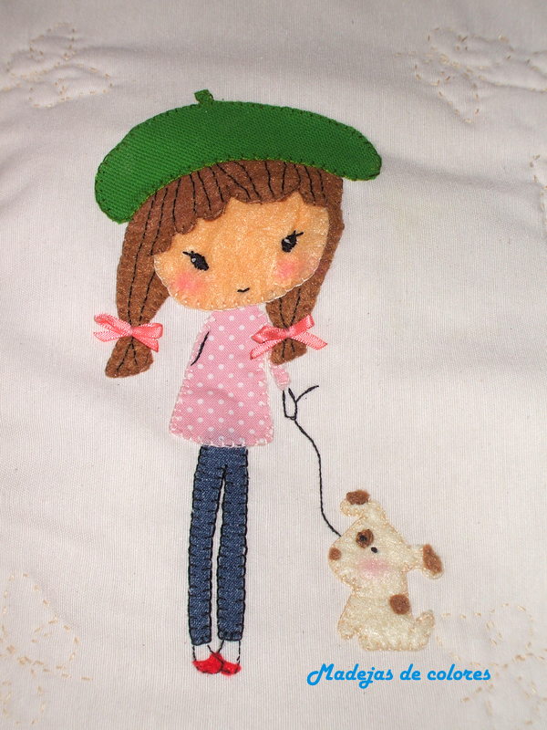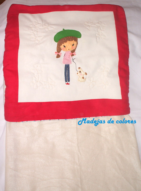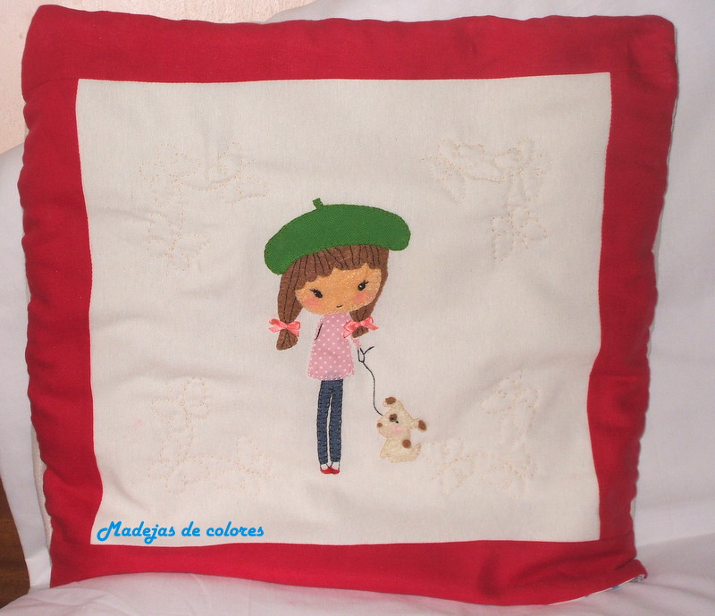 Y este es el cojín-manta, con una simpática muñeca muy al estilo parisino, paseando a su perro.