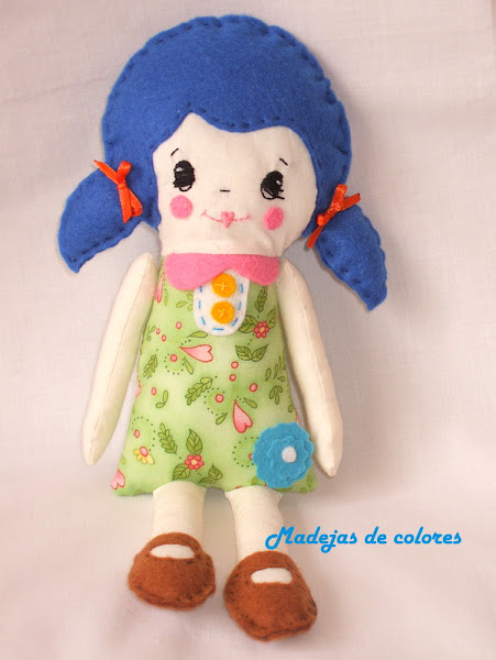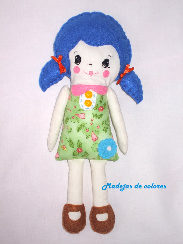 La muñeca está realizada con telas y fieltro de alegres colores.