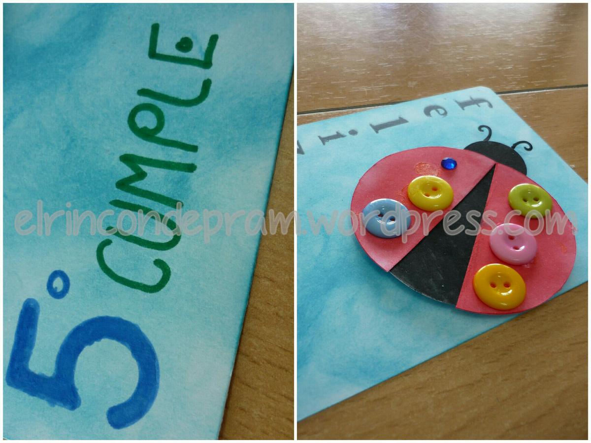 Para la tarjeta de Up & Scrap, he aplicado una tinta azul para fondo y he hecho una mariquita (Uppy, mascota de la tienda) con dos círculos grandes, uno pequeño y algunos botones de colores.