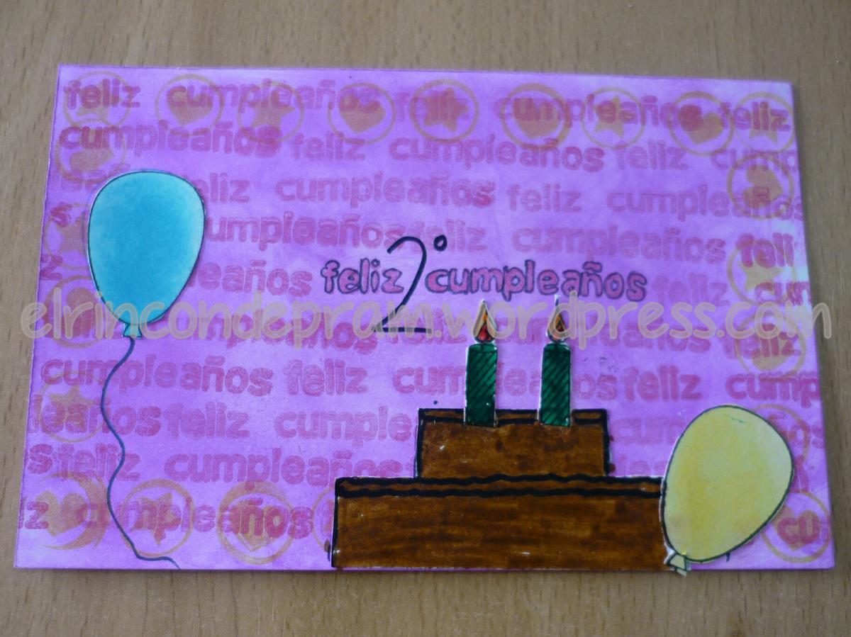 Para la felicitación de Anita y su Mundo, he aplicado una tinta de fondo magenta. Una vez seca, he hecho un fondo con el sello “feliz cumpleaños” por todo el papel y luego he añadido algunas decoraciones (globos, velas, una tarta) pintados con rotulador.