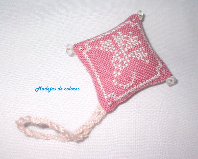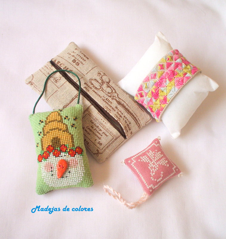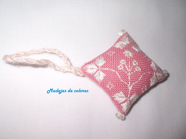 Un delicado buscatijeras en lugana rosa maquillaje oscuro y un delicado bordado en blanco roto.